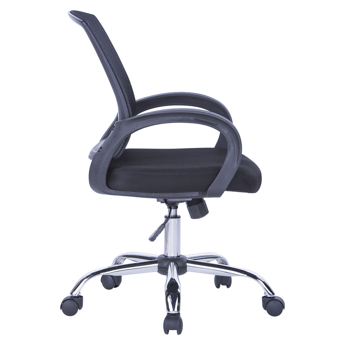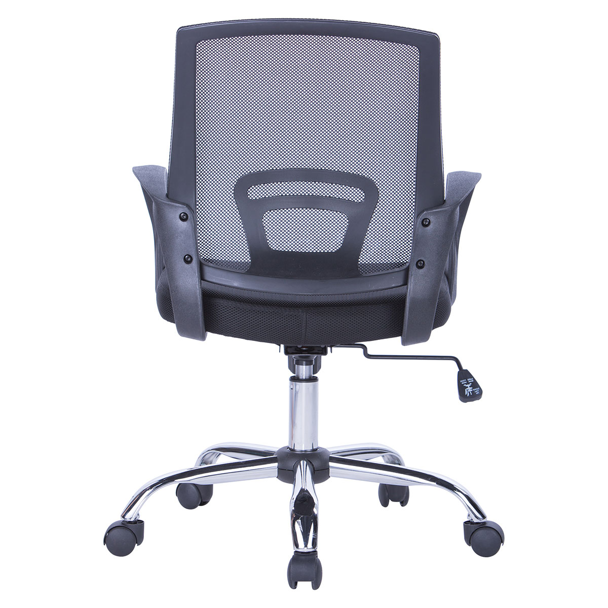Color: Negro  Brazos:  fijos en polipropileno color negro.   Mecanismo: MS: Mecanismo Fijo (Espaldar fijo). Cilindro Neumático: Ajuste de altura del asiento con elevación de gas. Material: Acero.  Color: Negro. Telescopio protector en polipropileno; color negro.  Estrella de 5 aspas. Diámetro: 600 mm.  Material: Acero. Calidad Bifma.    Rodachinas doble carrete.  Material: Nylon  Calidad Bifma, Color Negro. Diámetro: 50 mm.