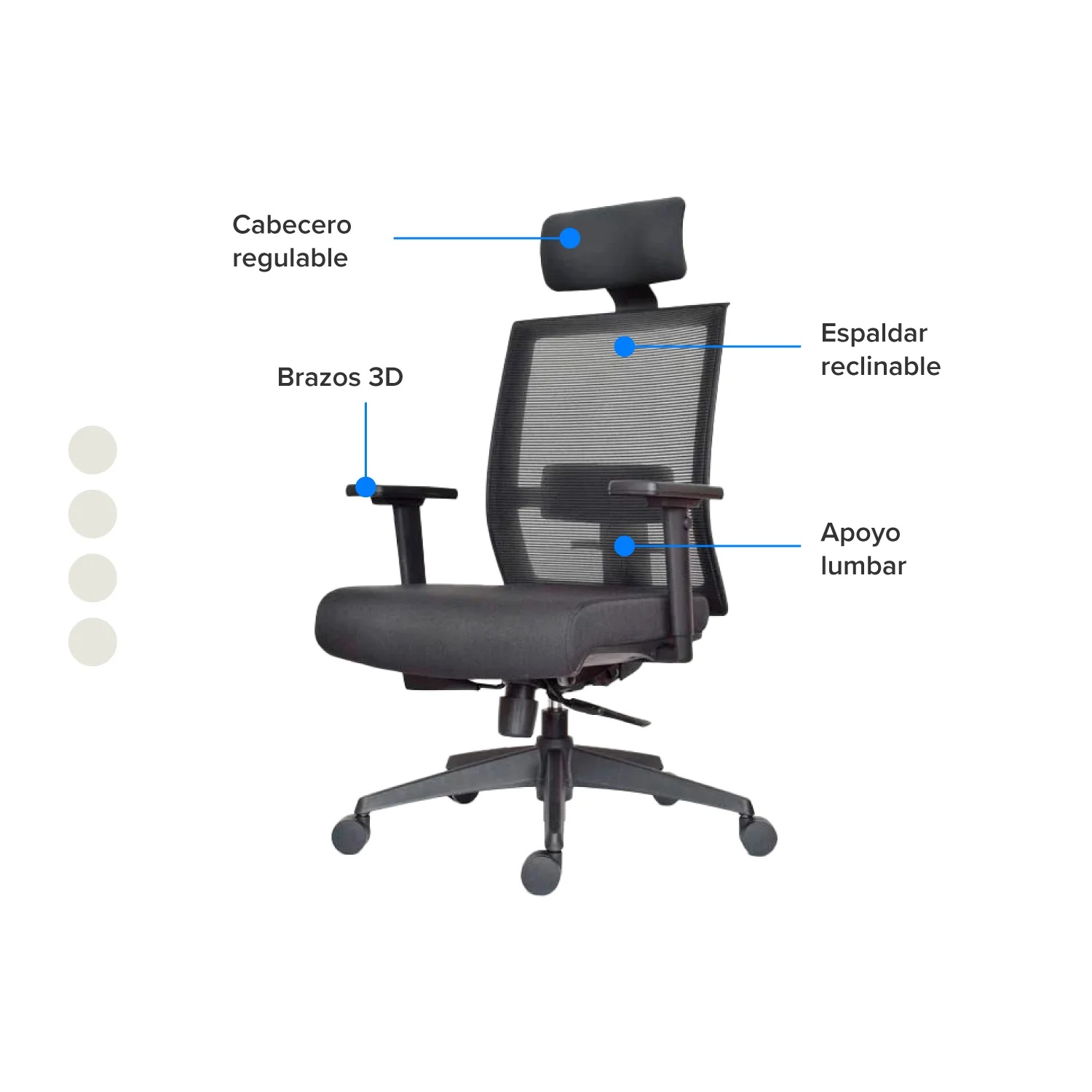 Cuenta con altura ajustable, apoyo lumbar, brazos 3D acolchados, cabecera y mecanismo syncro, que permite inclinar el respaldo y fijarlo en la posición deseada. Esta diseñada para brindarte comodidad durante largas jornadas gracias a su diseño ergonómico.