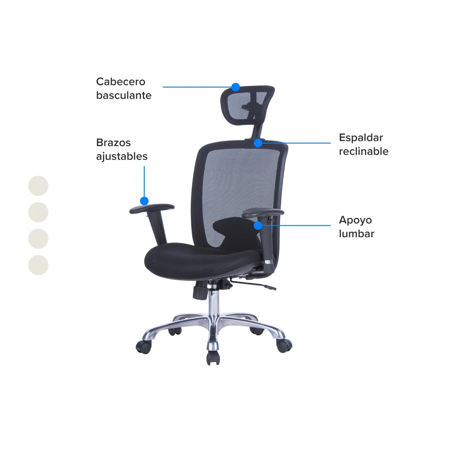 Brazos: Brazos: Ajustables en altura, fabricados en polipropileno color negro con pad en poliuretano tipo piel integral