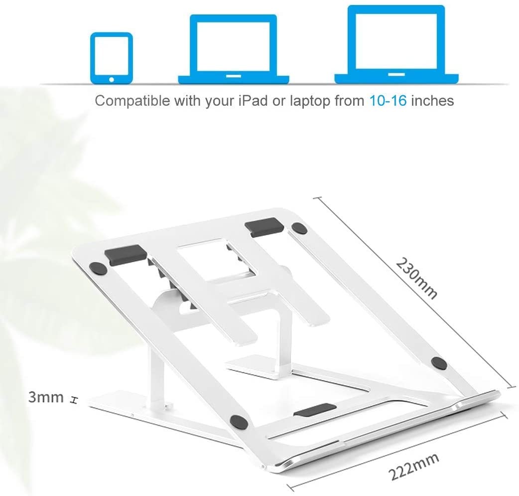 - ANTIDESLIZANTE DISEÑO: Soportes para portatiles con pies antideslizantes mantienen su computadora portátil en su lugar y protegen cualquier superficie sobre la que se coloque. Las almohadillas de silicona en la parte inferior del soporte aseguran que el producto se mantenga estable incluso al escribir. Está hecho de aleación de aluminio de calidad, soporta hasta 12 kg.